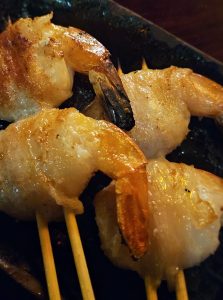 Prawns wrapped in pork belly grilled yakitori style. With Japanese mayo on the side